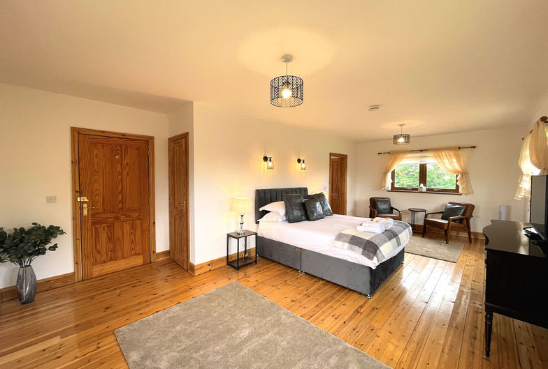 Bedroom 2 (Master bedroom):- King room with TV, seating area and large en-suite with jacuzzi bath.